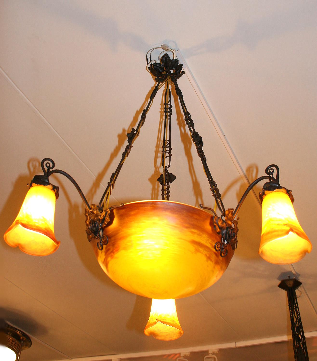Плафоны люстры выполненны на стекольной фирме братьев Мюллер в стиле Лотарингского модерна (Школа Нанси). Каждый плафон подписан. Люстра отличается высочайшим качеством исполнения, многообразием приёмов художественной обработки.